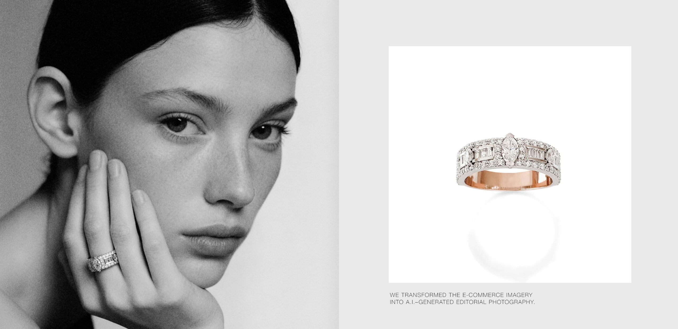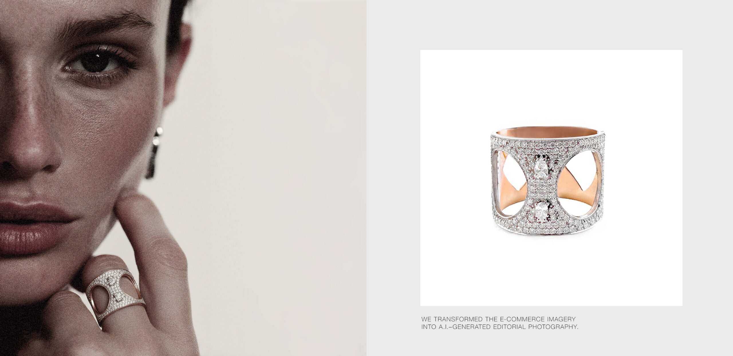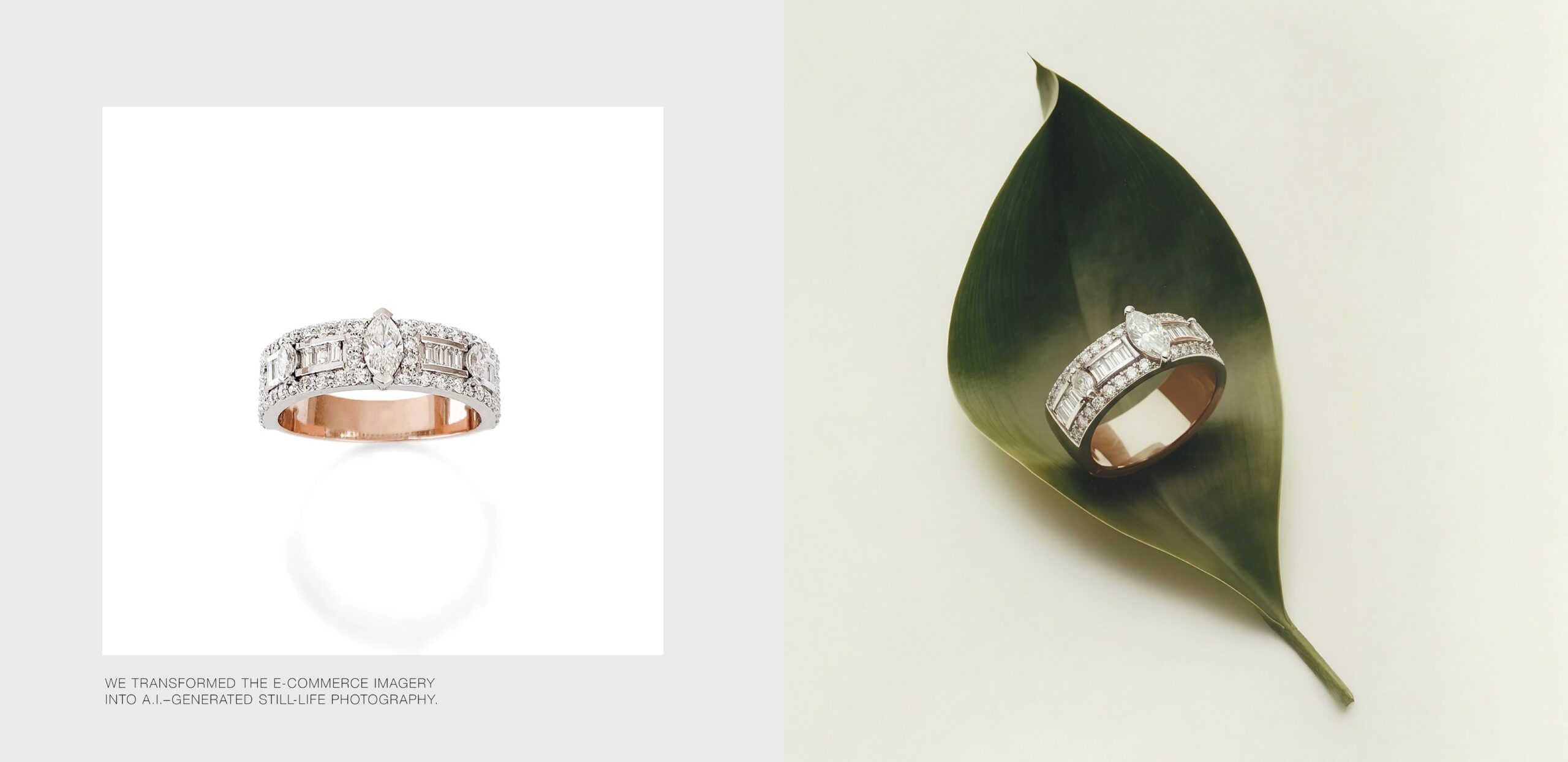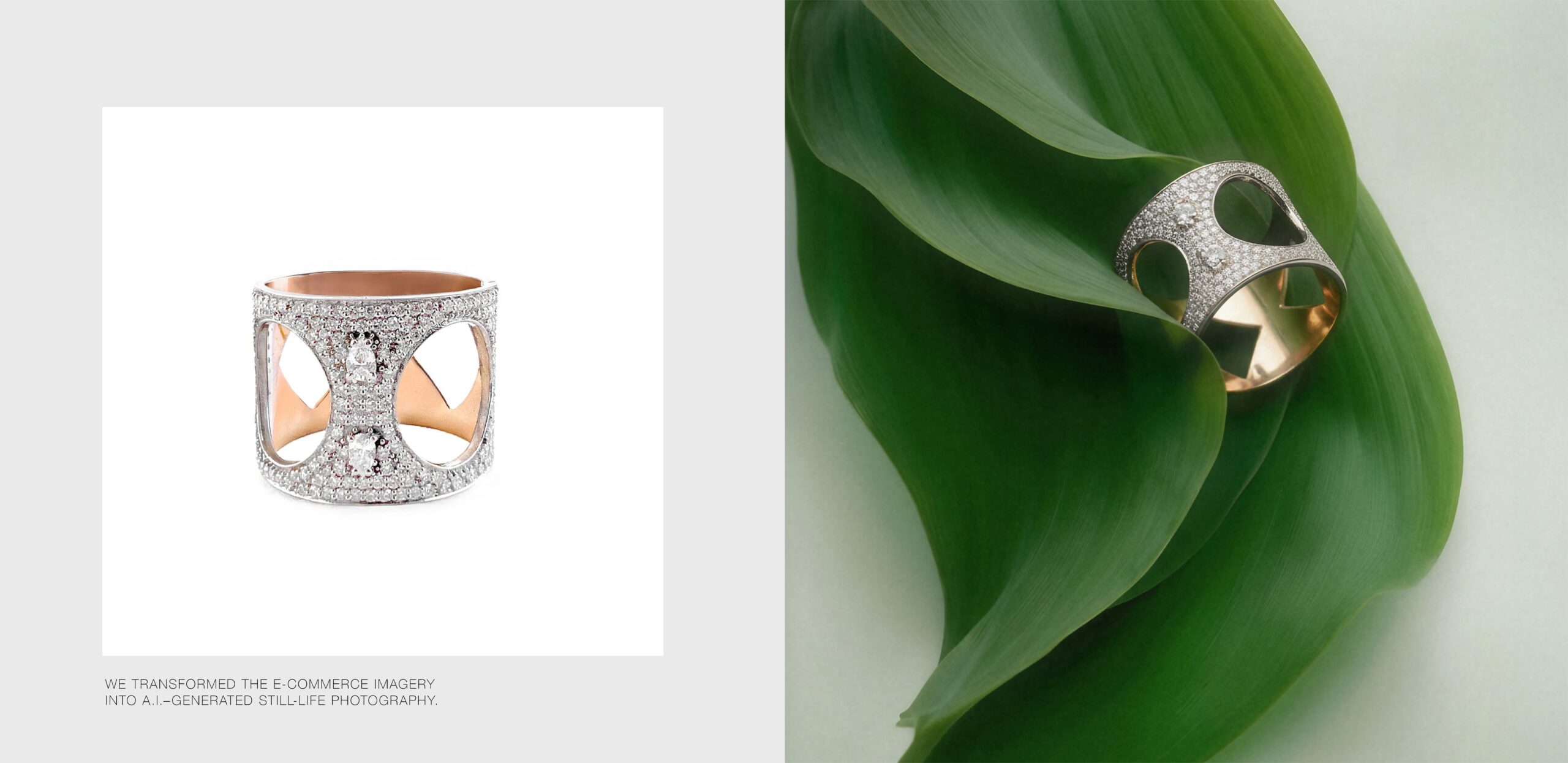 For this project, our client provided their e-commerce product photography, and we reimagined it through AI-driven still life compositions. By blending the realism of the original assets with generative design, we created elevated visuals that move beyond functional product shots — transforming jewelry into poetic objects of desire.